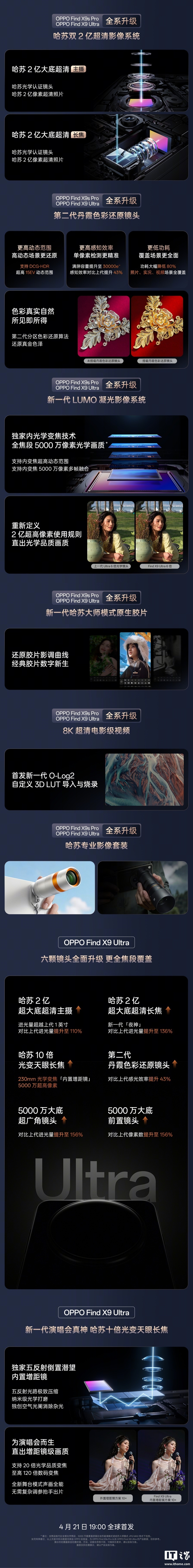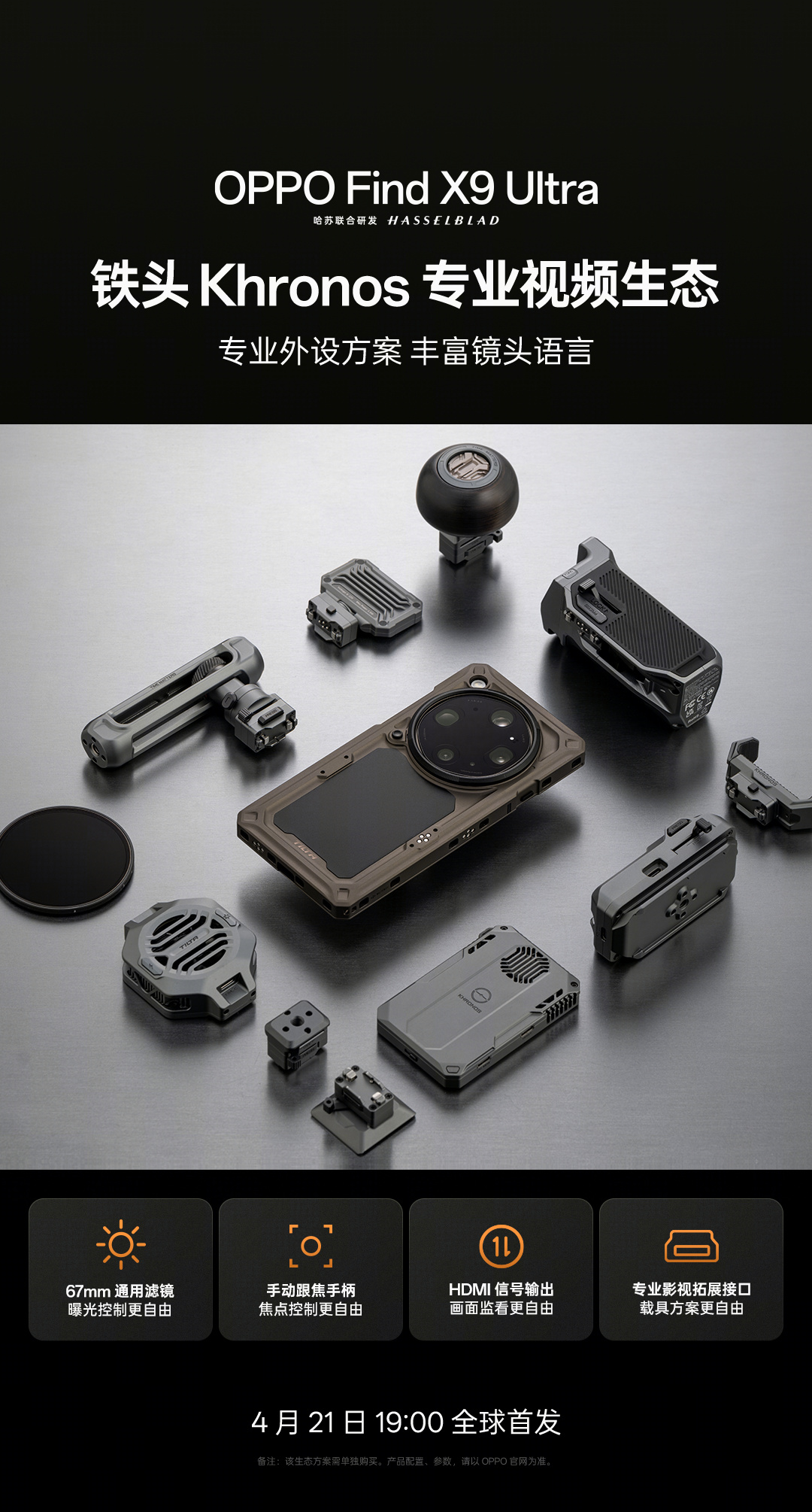 IT之家 4 月 20 日消息,今天上午,OPPO 手机宣布:OPPO Find X9 Ultra 手机配备能够实现“焦段自由”和“构图自由”的全大底专业视频镜头组,并首发全新 O-Log2 及原生支持 3D LUT 导入与烧录,支持铁头 Khronos 专业视频生态、专业外设方案,号称“一键直出电影感”。