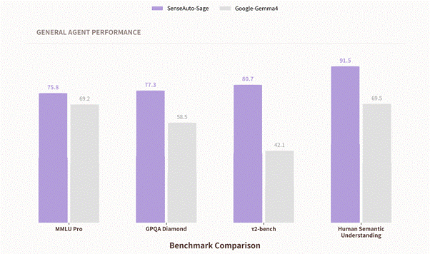 在重点考察任务执行能力的 τ2-bench(工具调用与任务闭环)基准上,Sage 以 80 分的成绩相较 Gemma 4 实现 38% 的提升,接近翻倍领先。这项基准专门评估模型调用工具、走完多步任务的实战能力,也是区分"会聊天的模型"与"会办事的智能体"的关键分水岭。τ2-bench 上近一倍的领先,直接印证了 Sage 作为端侧智能体基座在真实任务执行环节上的绝对优势。