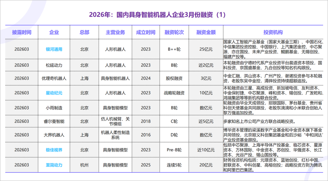 2026年3月,中国具身智能机器人赛道融资热度持续升温。其中,基础模型层与核心部件层的企业融资规模显著: 基础模型企业:极佳视界(Pre-B轮10亿元融资)、灵初智能(天使+Pre-A轮累计20亿元融资)、至简动力(近半年连续5轮累计20亿元融资)均聚焦”机器人大脑”技术方向,重点布局VLA模型、世界模型等关键领域。 核心部件与基础设施企业:地瓜机器人(B1轮1.2亿美元融资)专注机器人芯片与操作