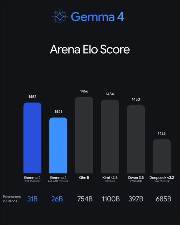 快科技4月3日消息,今天凌晨,谷歌DeepMind正式推出新一代开源大模型Gemma 4,该模型与谷歌闭源旗舰Gemini共享底层技术,也是时隔一年对Gemma 3的重大升级。此次谷歌一改此前自有协议,采用Apache 2.0商业友好型许可证开源,开发者可无门槛自由修改、分发和商用。一口气推出四款不同规格模型,覆盖从手机、边缘设备到工作站、服务器的全场景部署,在参数效率上表现亮眼,31B版本更是跻