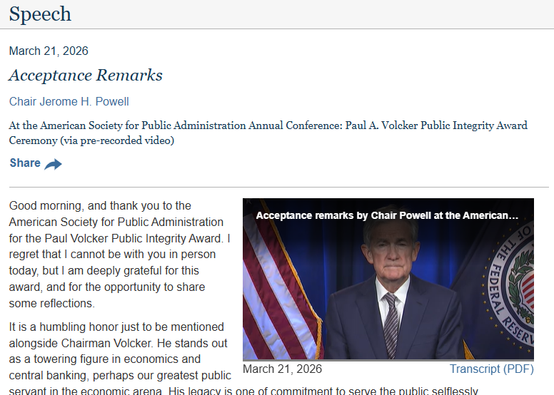 美联储主席鲍威尔在最新的演讲视频中表示,前主席保罗·沃尔克为公务员树立了榜样,并强调“独立与诚信密不可分”。当地时间周六(3月21日),美联储在官网发布了一段事先录制的演讲视频,鲍威尔对被美国公共管理学会(ASPA)授予“保罗·沃尔克公共诚信奖”表达了感谢。“很遗憾今天我无法亲自到场,但我由衷感谢这份荣誉,也感谢有机会与大家分享我的感想,”鲍威尔说道,“能与前主席沃尔克相提并论,我深感荣幸。”上世