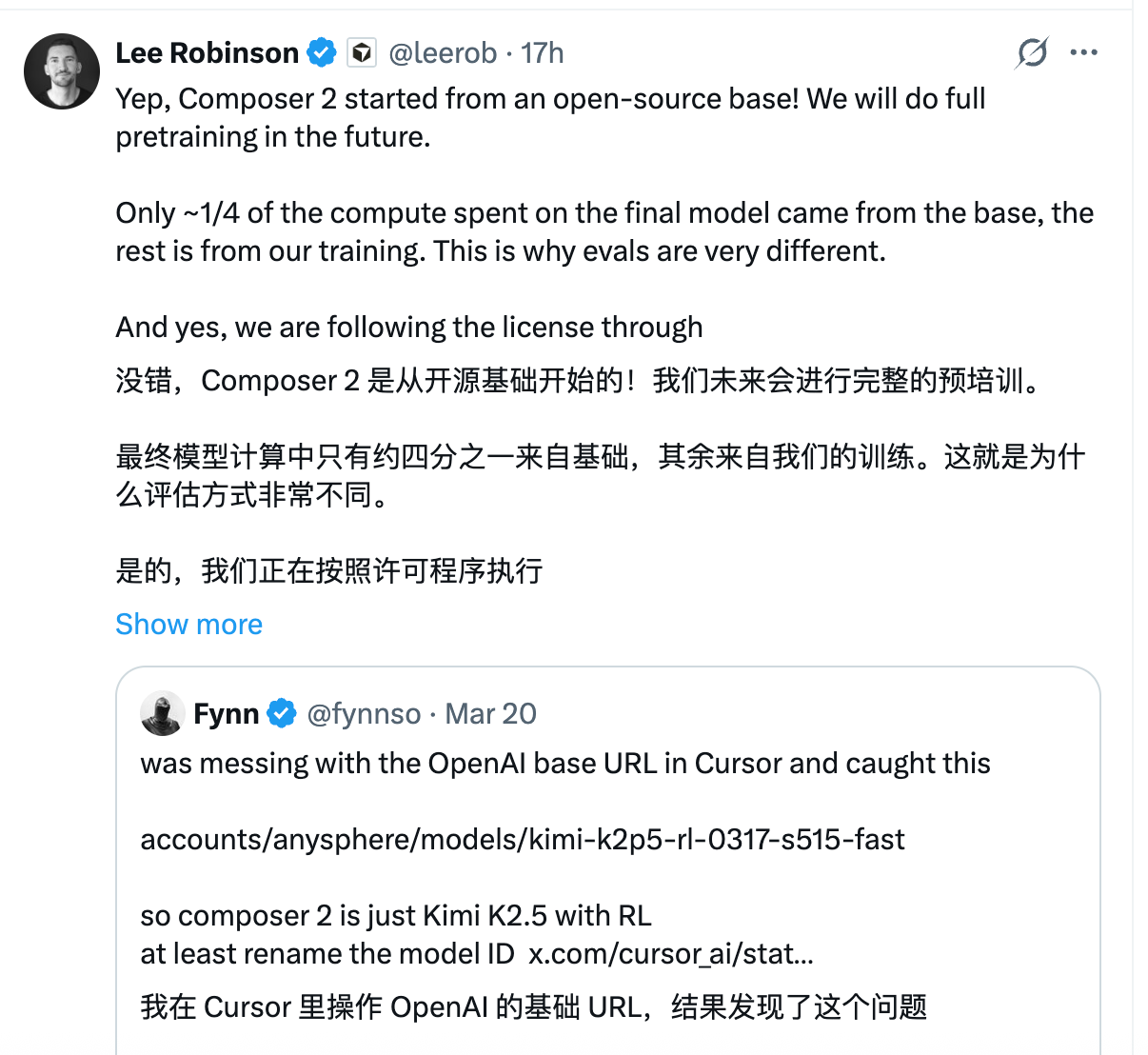 北京时间3月21日凌晨,一场围绕海外估值近300亿美元明星公司是否套壳中国开源模型的讨论,在网络端悄然展开。 事件起因属于美国编程垂直公司Cursor近日发布了一款新模型Composer 2,官方强调该模型通过持续预训练与强化学习自研而来,未提及基座来源。 其后,一位开发者在体验模型、调用API的过程中发现了一段模型ID——accounts/anysphere/models/kimi-k2p5-r