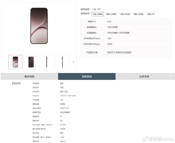 快科技3月21日消息,一加15T已现身中国电信终端产品库,结合官方预热公布的信息,这款小屏旗舰的基本参数已经完全揭晓。新机正面搭载6.32英寸1.5K LTPS直屏,四等窄边框设计,拥有1.1mm行业最窄四等边,支持超声波指纹,而且支持小屏唯一的165Hz高刷,前置相机1600万像素。核心搭载骁龙8 Elite Gen 5+LPDDR5X Ultra Pro+UFS 4.1存储规格,安兔兔跑分突破