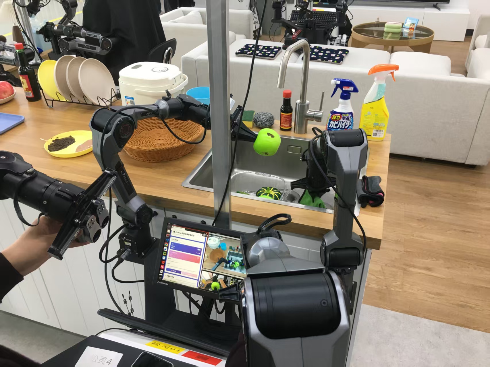界面新闻记者|金晶 界面新闻记者|文姝琪 正常人类洗4个水果,可能只需要1分钟,但在北京人形机器人创新中心具身智能机器人数据与训练基地,一个机器人洗完4个水果,需要8分钟,而这还是在人工通过遥操作器控制的前提下完成的。 不过,要让机器人真正有一天能进入家庭完成洗水果这件事,通过大量重复行为获取训练数据,再交由大模型学习,是必经之路。北京人形机器人创新中心具身智能机器人数据与训练基地,正尝试围绕这一