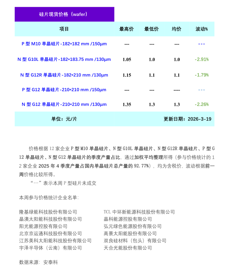 智通财经APP获悉,硅业分会发文称,据安泰科统计,本周单晶硅片价格小幅下跌。其中,N型G10L单晶硅片(182*183.75mm/130μm)成交均价在1.0元/片,环比上周下跌2.91%;N型G12R单晶硅片(182*210mm/130μm)成交均价在1.1元/片,环比上周下跌1.79%;N型G12单晶硅片(210*210 mm/130μm)成交均价在1.3元/片,环比上周下跌2.26%。据调研