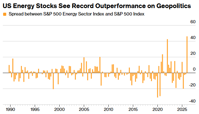 智通财经APP获悉,由于中东战争以及投资者纷纷抛售估值高昂的科技股,美国能源股有望以有史以来最大的幅度跑赢大盘。标普500能源指数今年第一季度迄今已上涨39%,而标普500指数则下跌了7% 。该板块已连续14周上涨,远超2007年创下的9周上涨纪录。埃克森美孚(XOM.US)和康菲石油(COP.US)等公司有望创下有史以来最佳季度涨幅,今年前三个月涨幅均超过40%。自委内瑞拉1月份迎来新领导人以及