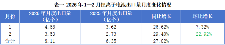 智通财经APP获悉,3月31日,据中国化学与物理电源行业协会披露,2026年1—2月,我国锂离子电池出口数量达8.11亿个,同比增长27.82%;出口额为142.04亿美元,同比增加46.28%,整体表现亮眼,呈现“量价齐增”的态势。德国是我国锂离子电池第一大出口市场,2026年1—2月出口金额达21.91亿美元,同比增长25.34%,占我国锂离子电池出口总额的15.4%。美国为第二大市场,同期出