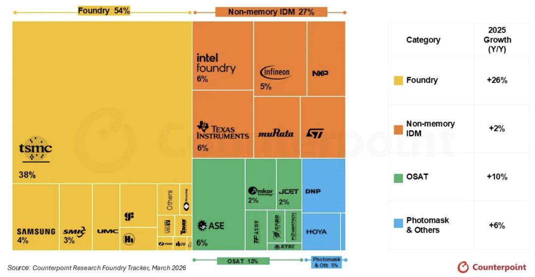 智通财经APP获悉,半导体行业已正式迈入晶圆代工2.0时代,这一阶段的核心特征是制造、封装与测试深度融合,并在全球人工智能热潮的驱动下实现盈利性增长。根据Counterpoint Research最新发布的晶圆代工市场供应追踪报告,2025年全球晶圆代工2.0市场营收达到3200亿美元,同比增长16%。这一双位数增长主要得益于先进制程制造与先进封装领域对AI GPU和AI专用芯片(ASIC)的稳定