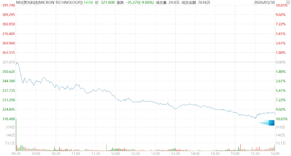 美光科技股价持续重挫,华尔街认为其正经历一场与强劲基本面严重背离的恐慌性抛售。 3月30日周一,美光股价单日跳水近10%,自3月18日发布超预期财报以来累计跌幅已达30%。 (周一美光科技股股价一度跌超10%) 与此同时,华尔街的看涨阵营几乎纹丝未动,43位分析师中有38位维持买入或强力买入评级,摩根大通坚守550美元目标价。 华尔街见闻提及,上周谷歌宣布推出TurboQuant算法,声称可显著降