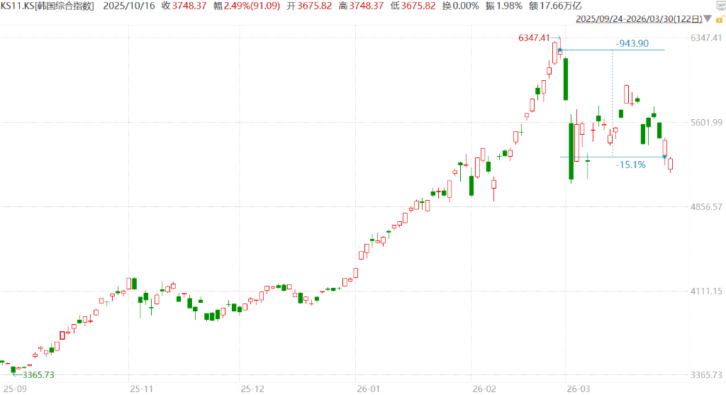 中东战争冲击与芯片需求降温两大压力同步袭来,曾经风头无两的韩国股市正遭遇严峻考验。 3月以来,韩国综合股价指数已下跌15%,跌幅位居全球主要市场前列。海外资金持续撤离,规模逼近历史纪录,截至上周五,韩国市场本月市值累计蒸发约4930亿美元。 (韩国综合股价指数3月份已累跌超15%) 油价飙升压制高度依赖能源进口的韩国经济前景,与此同时,市场对人工智能相关存储芯片需求能否持续的疑虑也开始蔓延。 SK