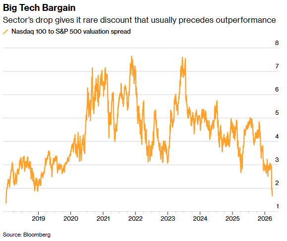 智通财经APP获悉,大型科技股的大跌已将纳斯达克100指数推入技术性回调,而市场正浮现出一些历史上曾预示该板块走势逆转的信号。其中最关键的信号,是大型科技股相对大盘的估值溢价已被大幅抹去。从历史经验看,这种估值压缩往往为该板块后续跑赢市场奠定基础。自去年10月创下历史高点以来,这个以科技股为主的指数已累计下跌11%,目前其预期市盈率约为21倍(基于未来12个月盈利),仅比标普500指数高出1.7个