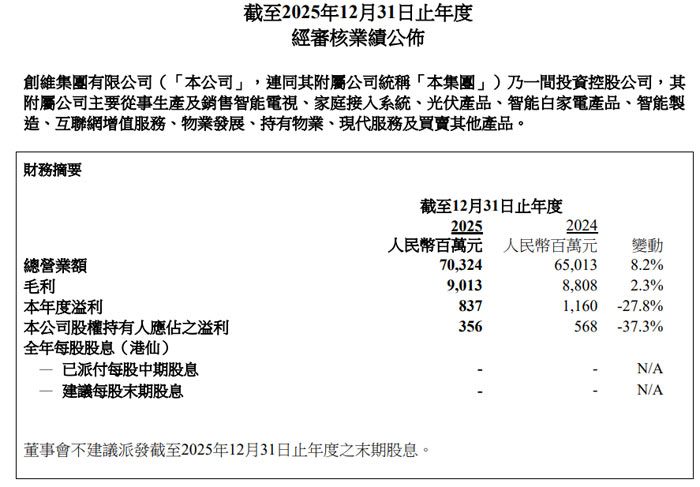 3 月 27 日,创维集团有限公司(股份代号:00751,下称 “创维集团”)发布 2025 年经审核年度业绩公告。报告期内,集团紧抓全球化与绿色发展机遇,实现营收稳步增长,各业务板块协同发展,其中新能源业务表现亮眼成为核心增长引擎;受行业环境及业务结构调整等因素影响,盈利端有所承压,集团董事会建议不派发末期股息,将留存现金用于企业发展规划。 财务数据方面,2025 年创维集团总营业额达 703.