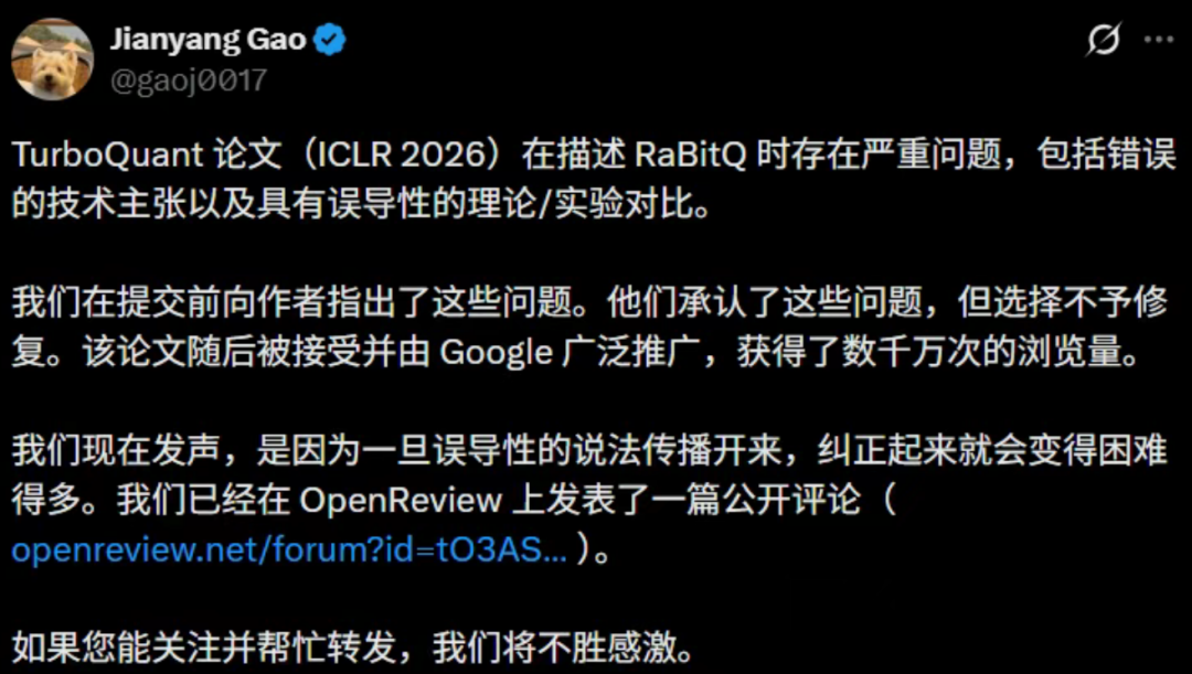 【TechWeb】3月29日消息,科技巨头谷歌遭遇了一场突如其来的“学术诚信”危机。这一切,都源于一篇号称能“颠覆AI内存市场”的论文。3月25日,谷歌高调发布TurboQuant压缩算法论文,声称这项技术能将AI大模型运行时最耗资源的KV缓存内存占用降至原来的1/6,速度提升8倍。消息一出,资本市场率先作出反应——美光、西部数据等存储巨头股价应声暴跌,单日总市值蒸发超过900亿美元。业界惊呼,这
