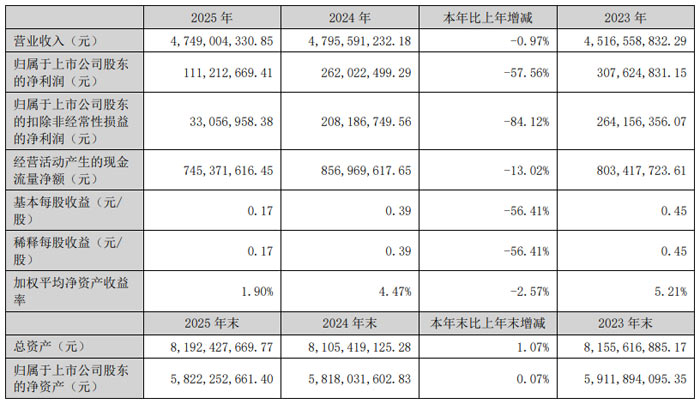 2026 年 3 月,苏州安洁科技股份有限公司(股票简称:安洁科技,股票代码:002635)发布 2025 年年度报告。报告显示,公司全年实现营业收入 47.49 亿元,较上年同期小幅下降 0.97%;归属于上市公司股东的净利润 1.11 亿元,归属于上市公司股东的扣除非经常性损益的净利润 0.33 亿元;基本每股收益 0.17 元。截至 2025 年末,公司总资产达 81.92 亿元,归属于上市