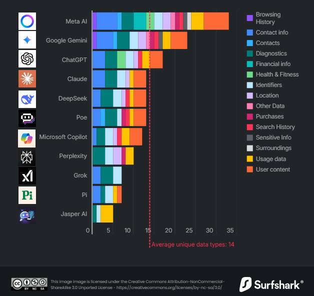 IT之家 3 月 28 日消息,网络安全公司 Surfshark 最新报告显示,主流 AI 聊天机器人正大肆收集用户联系方式与浏览记录。目前高达 70% 的 AI 应用会获取用户位置信息,而该比例在 2025 年仅为 40%。IT之家附上相关图表如下:按照苹果应用商店的 35 种数据分类标准,AI 应用平均收集 14 种用户数据。而 Meta AI 收集多达 33 种数据,占比约 95%,是唯一获