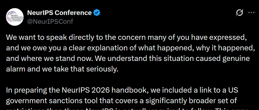 智东西(公众号:zhidxcom) 作者 | 杨京丽 编辑 | 李水青 智东西3月27日报道,今天下午,AI三大顶会之一NeurIPS官方在X平台发布声明,就此前引发轩然大波的制裁合规条款正式致歉。 ▲NeurIPS官方在X平台发布声明(中文转译版) 声明称,在编写NeurIPS 2026手册的过程中,NeurIPS加入了一个美国政府制裁查询工具的链接,其覆盖范围远超NeurIPS实际需要遵守的限