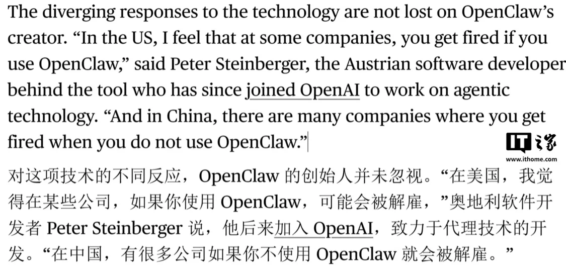 IT之家 3 月 27 日消息,昨日(3 月 26 日)在接受彭博社采访时,“龙虾” OpenClaw 之父彼得 · 斯坦伯格(Peter Steinberger)指出中国企业正狂热拥抱甚至强制员工使用 AI,而美国企业则因安全担忧出台限制政策。在 AI 应用方面,斯坦伯格指出中美两国目前存在巨大差异。在中国,学生、工人和老年人纷纷涌入测试 OpenClaw,部分企业甚至要求员工使用该产品探索提升