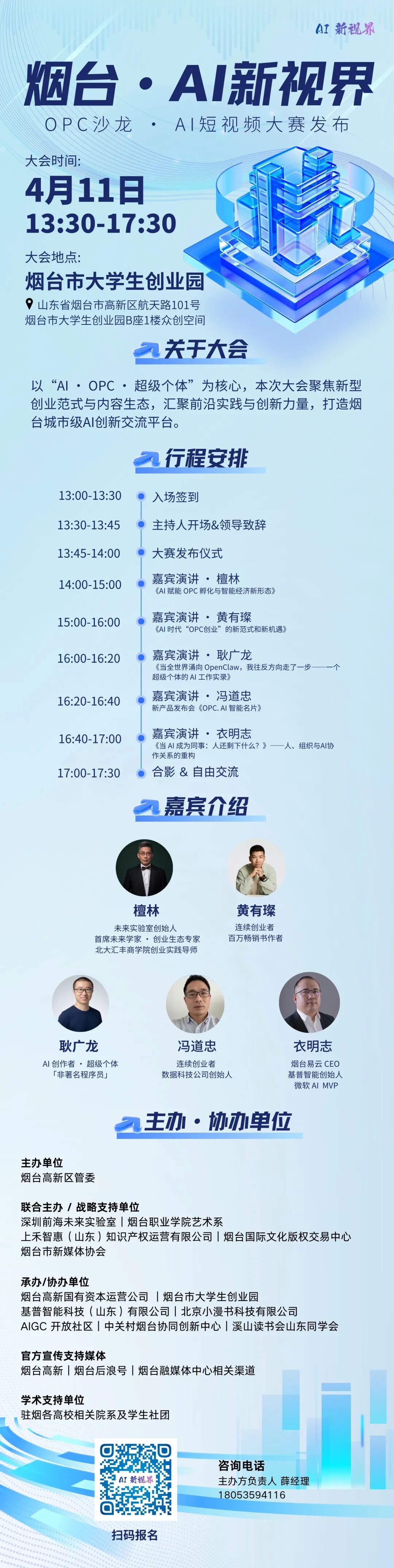 专注AIGC领域的专业社区,关注微软&OpenAI、百度文心一言、讯飞星火等大语言模型(LLM)的发展和应用落地,聚焦LLM的市场研究和AIGC开发者生态,欢迎关注!在 AI 快速发展的时代背景下,新的创业模式、新的内容生态,正在加速形成。为推动烟台 AI 产业交流与创新实践,“烟台·AI新视界” OPC 沙龙暨 AI 短视频创作大赛发布会,将于2026年4月11日在烟台市大学生创业园正式举办。活