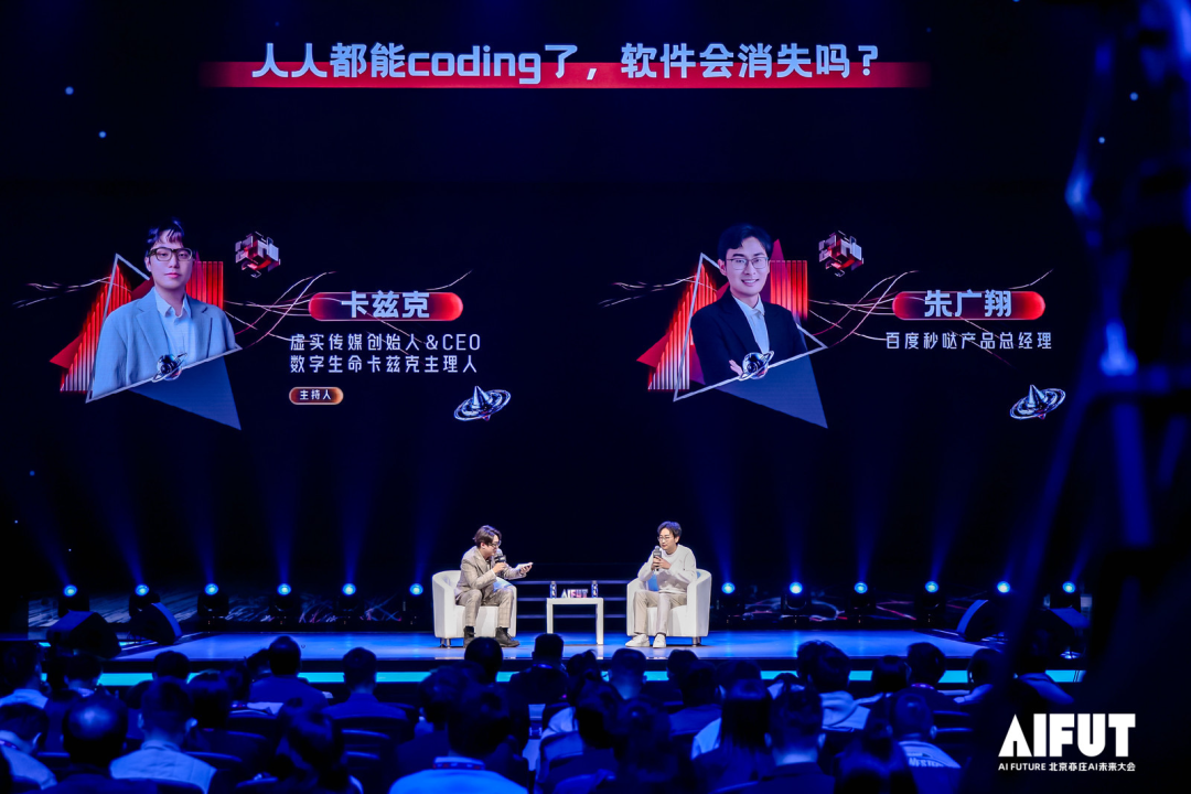 繁忙的上午结束,下午,我大多时候都能安闲地坐在下面看,太爽了。不过,下午,我还是上台做了一场1v1访谈,访谈的嘉宾是百度秒哒的产品总经理朱广翔,也是我认识多年的好朋友。我和广翔聊了快40分钟,信息密度比我预想的高太多了。广翔是计算机博士,写了20年代码,但他告诉我他已经两年没写代码了。他说写代码这个活,可能真的要变成古法了,如果今天还有人在学,那就别学了。这句话从一个写了20年代码的人嘴里说出来,