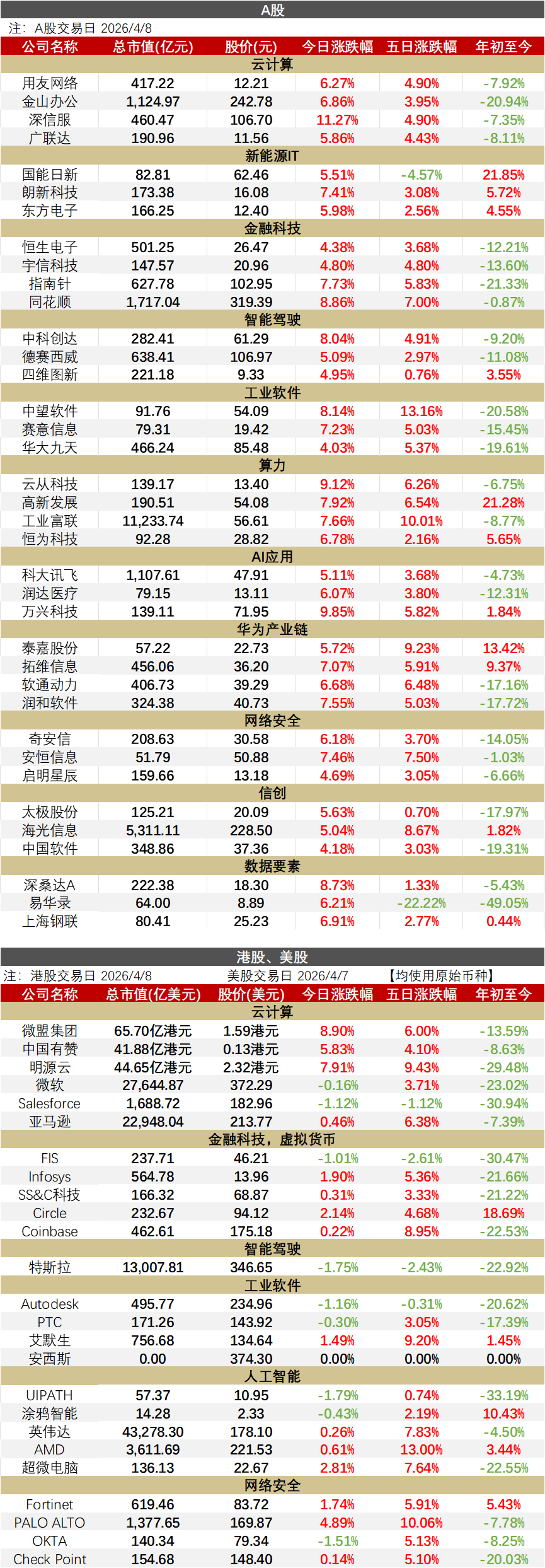 今日行情国内行业要闻► DeepSeek上线专家模式,支持深度思考与智能搜索DeepSeek新增“快速模式”与“专家模式”分层设计。快速模式适合日常对话,即时响应;专家模式擅长复杂问题,支持深度思考和智能搜索,但不支持文件上传与多模态功能,高峰时需等待。此举为走红以来首次引入模式分层,或为V4模型预热。(来源:IT之家)► 智谱发布新一代旗舰模型GLM-5.1,同步提价10%智谱推出开源模型GLM