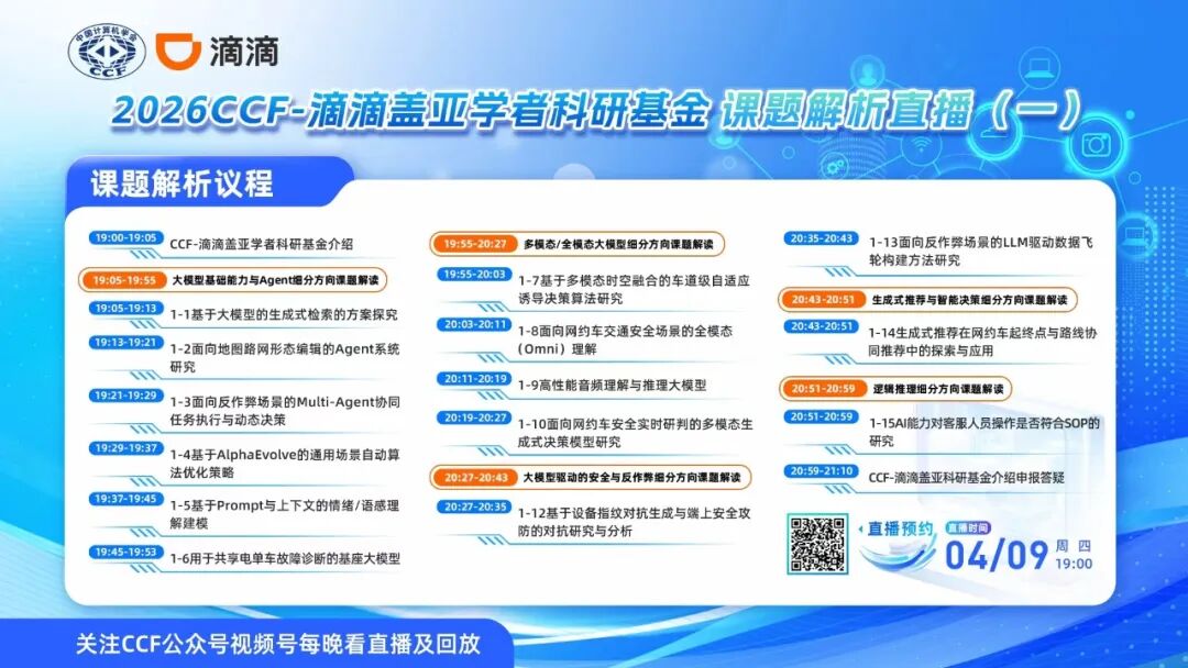 2026年CCF-滴滴盖亚学者科研基金共发布26项课题,课题即将于2026年4月15日23:59(北京时间)截止申报,欢迎CCF会员积极申报。为了进一步加速构建产学研协作共同体,以开放视野携手推进尖端人才培养,2026年CCF-滴滴盖亚学者科研基金持续深入挖掘业务场景,拓展研究话题,涵盖大模型及其应用、机器学习与运筹优化、自动驾驶、安全攻防、岗位画像研究等多个研究方向的真实业务场景,共开放申报26