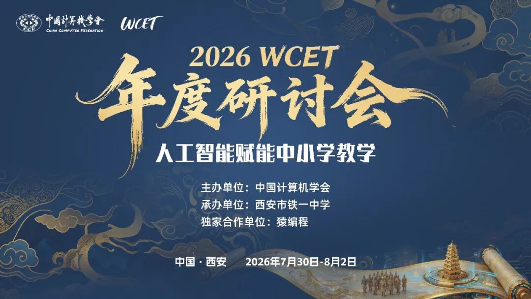由中国计算机学会(CCF)主办,西安市铁一中学承办的2026 WCET年度研讨会将于7月30日-8月2日在西安举行。本届大会主题是“人工智能赋能中小学教学”。即日起大会报名正式开启,6月16日前报名可享报名优惠!当人工智能技术浪潮席卷教育领域,传统中小学教学正迎来前所未有的变革与机遇。为探讨人工智能与中小学教学的深度融合路径,助力教师专业成长,由中国计算机学会(CCF)主办,西安市铁一中学承办的2