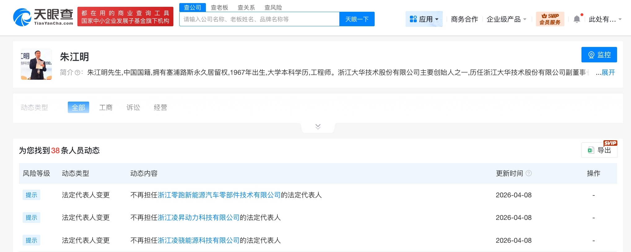 天眼查App显示,近日,浙江零跑新能源汽车零部件技术有限公司发生工商变更,朱江明卸任法定代表人、总经理并由执行董事变更为董事,曹力接任法定代表人并担任经理。公开资料显示,该公司成立于2021年3月,注册资本12亿人民币,经营范围含汽车零部件研发、汽车零部件及配件制造、电动机制造、机械电气设备制造、计算机系统服务、太阳能发电技术服务等。股东信息显示,该公司由零跑汽车(09863.HK)全资持股。值得