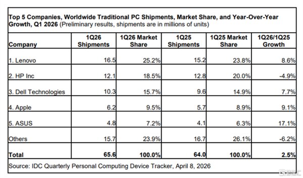 快科技4月10日消息,根据市场调研机构IDC发布的最新报告,联想在PC市场再次展现了强大的统治力。报告显示,联想以25.2%的市场占有率蝉联全球第一,继续领跑全球传统电脑市场。在全球宏观经济承压、内存组件短缺以及地缘冲突扰乱全球物流等多重压力下,全球PC出货量依然实现了逆势增长。第一季度总出货量达到6560万台,同比微增2.5%,整体表现优于行业此前的预期。头部厂商的格局正在经历新一轮洗牌。联想不