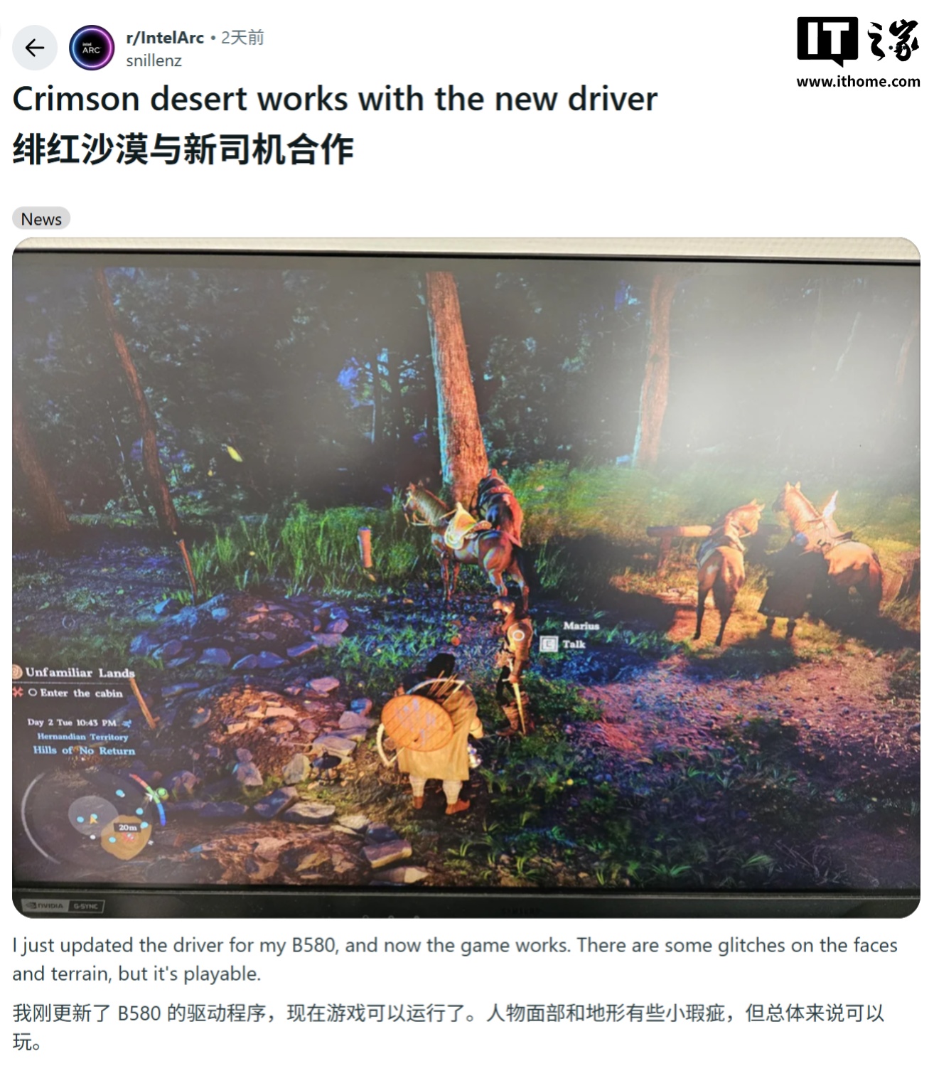 IT之家 4 月 10 日消息,科技媒体 Wccftech 昨日(4 月 9 日)发布博文,报道称最新 Game On 32.0.101.8629 WHQL 驱动程序终于解决游戏兼容性问题,英特尔显卡玩家也能运行《红色沙漠》(Crimson Desert)游戏了。IT之家此前报道,《红色沙漠》游戏此前因不支持锐炫(Arc)显卡而无法启动,弹出“图形设备当前不受支持”的错误提示,导致大量英特尔显卡玩