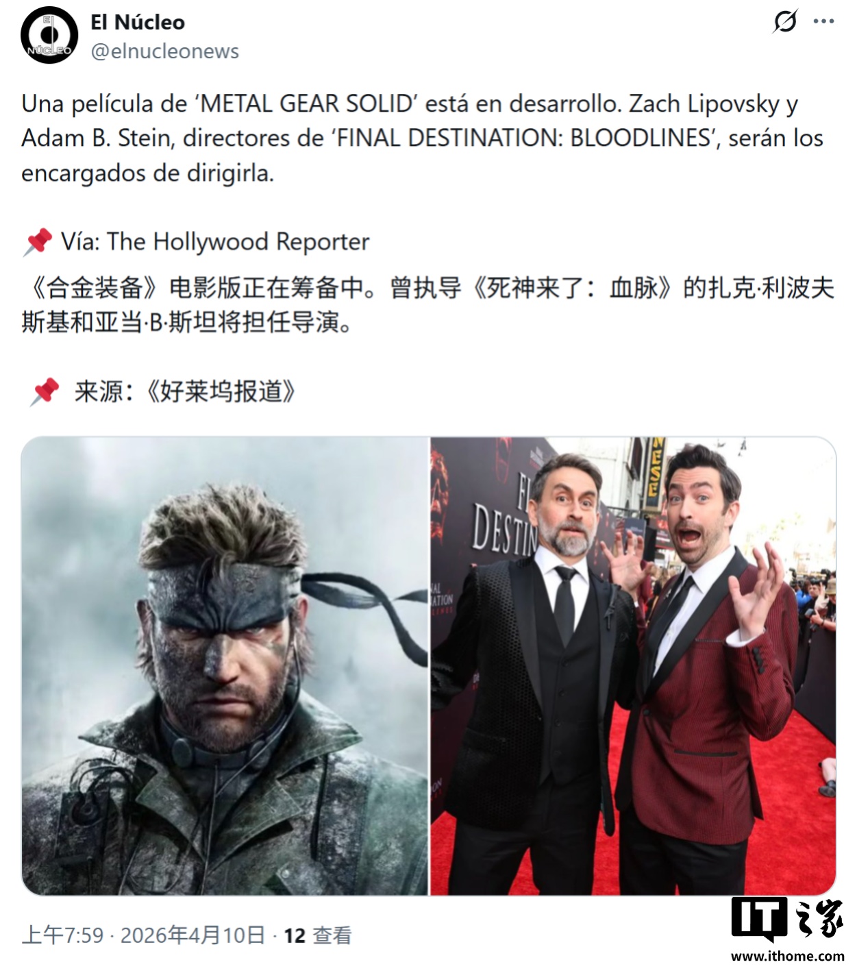 IT之家 4 月 10 日消息,The Hollywood Reporter 昨日(4 月 9 日)发布博文,报道称索尼影业已启动《合金装备》(Metal Gear Solid)电影项目,执导筒交予《死神来了:血脉诅咒》导演组合扎克 · 利波夫斯基(Zach Lipovsky)与亚当 ·B· 斯坦(Adam B. Stein)。报道称凭借《死神来了:血脉诅咒》的商业与口碑双丰收,导演双人组扎克 ·