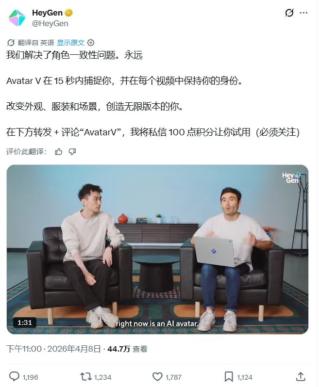 在数字人内容创作领域,角色形象一致性一直是行业痛点。无论是短视频制作、虚拟形象运营还是跨境内容产出,都容易出现面部特征、神态动作偏差的问题。 2026年4月9日,HeyGen数字人平台在著名社交媒体平台“X”的官方账号上正式推出的Avatar V功能,精准攻克这一难题,仅需15秒即可完成真人形象捕捉,让虚拟数字人在各类视频中始终保持统一身份特征,为创作者带来高效、便捷的数字人创作新体验。 工具地址