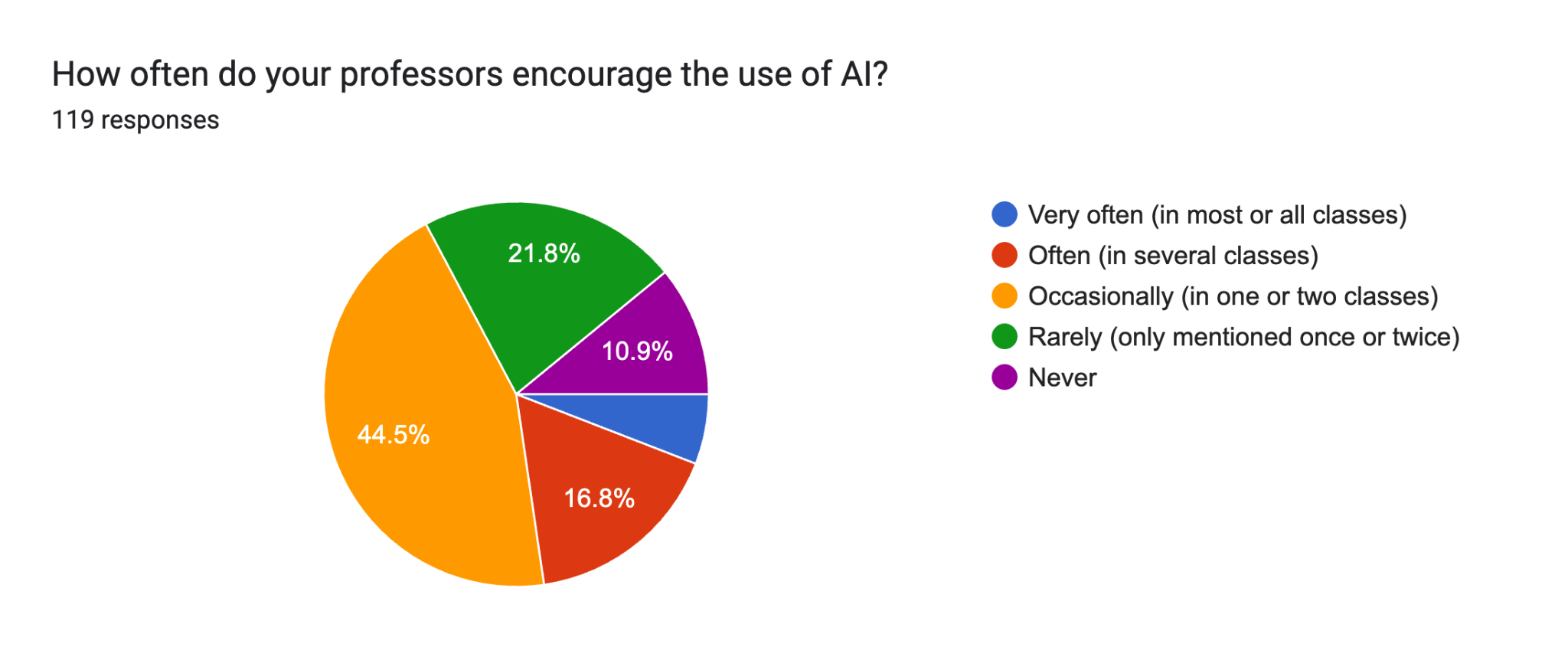 本次调研基于119份样本,呈现出AI在高校学习场景中的渗透路径与使用结构。从整体环境看,约44%的学生表示教师“偶尔鼓励”使用AI,仅约6%“经常鼓励”,而约33%处于“较少或从不鼓励”区间。这一结构反映出高校在AI使用规范上仍处于探索阶段,尚未形成统一教学范式。在制度供给不充分的背景下,AI使用更多由学生自发驱动,而非由课程体系主导,这种“弱引导+强自用”的格局,可能加剧使用方式的分化。从使用频