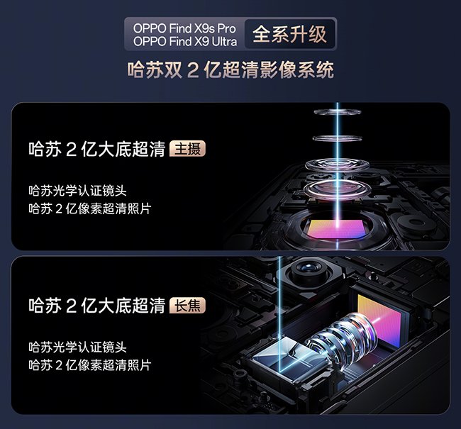 OPPO Find X9s Pro和OPPO Find X9 Ultra将于4月21日正式发布。在此之前,官方已进行多轮预热,今日再度放出海报,对两款机型的影像卖点进行了集中汇总,可以看出,定位为哈苏口袋相机,无论是Pro版还是Ultra版,影像能力均实现了相当大幅度的提升。根据官方海报信息来看,这两款机型均搭载了哈苏2亿主摄和哈苏2亿长焦,这意味着在更广的焦段范围内都能拍出高解析力的照片,局部放