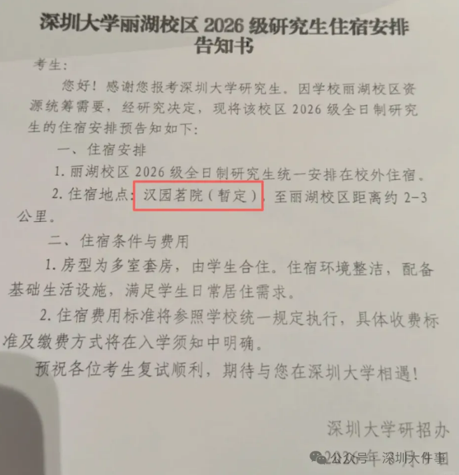 ▲深圳大学研招办发布的住宿告知书。图/南方都市报高校拟租套均800万“豪宅”,当学生宿舍!据《南方都市报》报道,近日,深圳大学的一份告知书显示,该校丽湖校区2026级全日制研究生将统一安排在校外住宿,地点暂定汉园茗院,住宿费用标准将参照学校统一规定执行。该小区业主向记者坦言,不愿自家小区被贴上“宿舍”标签。“小区容积率本来就很高,未来可能增加近千名学生,电梯、停车场、健身设施等公共资源肯定会被严重