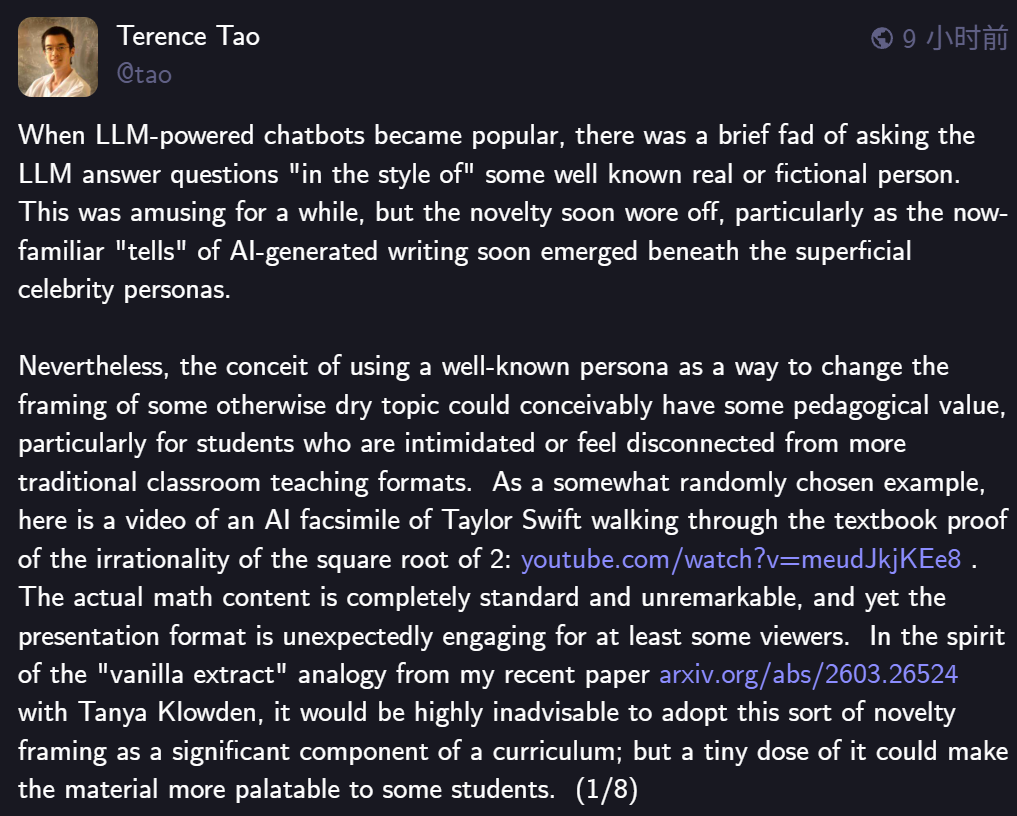 名人风格的 AI 助手具备教学潜力吗?陶哲轩和几个朋友调教出了五个不同人设的聊天机器人,并问了它们同一个关于牛顿万有引力的问题,结果发现答案差异非常大。考虑到每个人的口味差异同样很大,五个人设的答案总会吸引到一小部分人。如果一个学生可以挑选一个合心意的人设,并让对应的 AI 助手用这种风格来讲那些自己实在提不起兴趣去学的知识点,这倒可以成为一种有用的教学工具。以下为陶哲轩做这项实证研究的初衷与结果