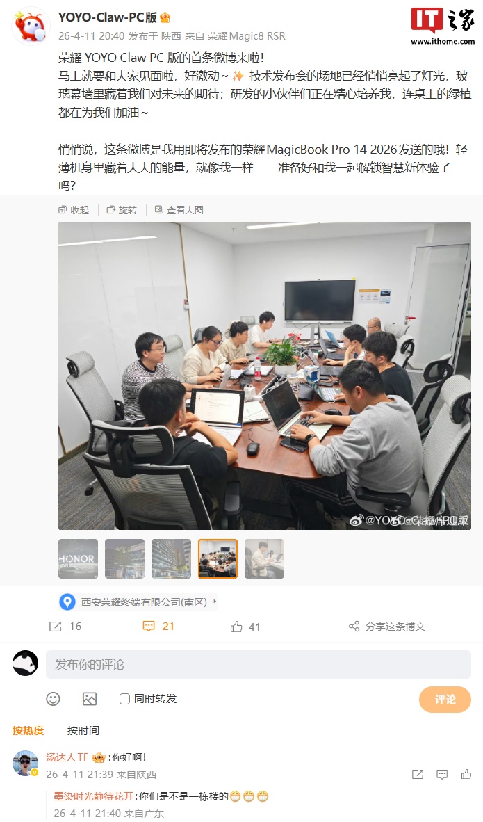 IT之家 4 月 12 日消息,微博账号 @YOYO-Claw-PC版 昨日发布了首条微博,宣告:“荣耀 YOYO Claw PC 版的首条微博来啦。”据该账号介绍,荣耀 YOYO Claw PC 版的首条微博由即将发布的荣耀 MagicBook Pro 14 2026 笔记本发送。这意味着荣耀 YOYO Claw PC 版“龙虾”将至,同时还有望随新笔记本一起亮相发布会。据IT之家此前报道,在