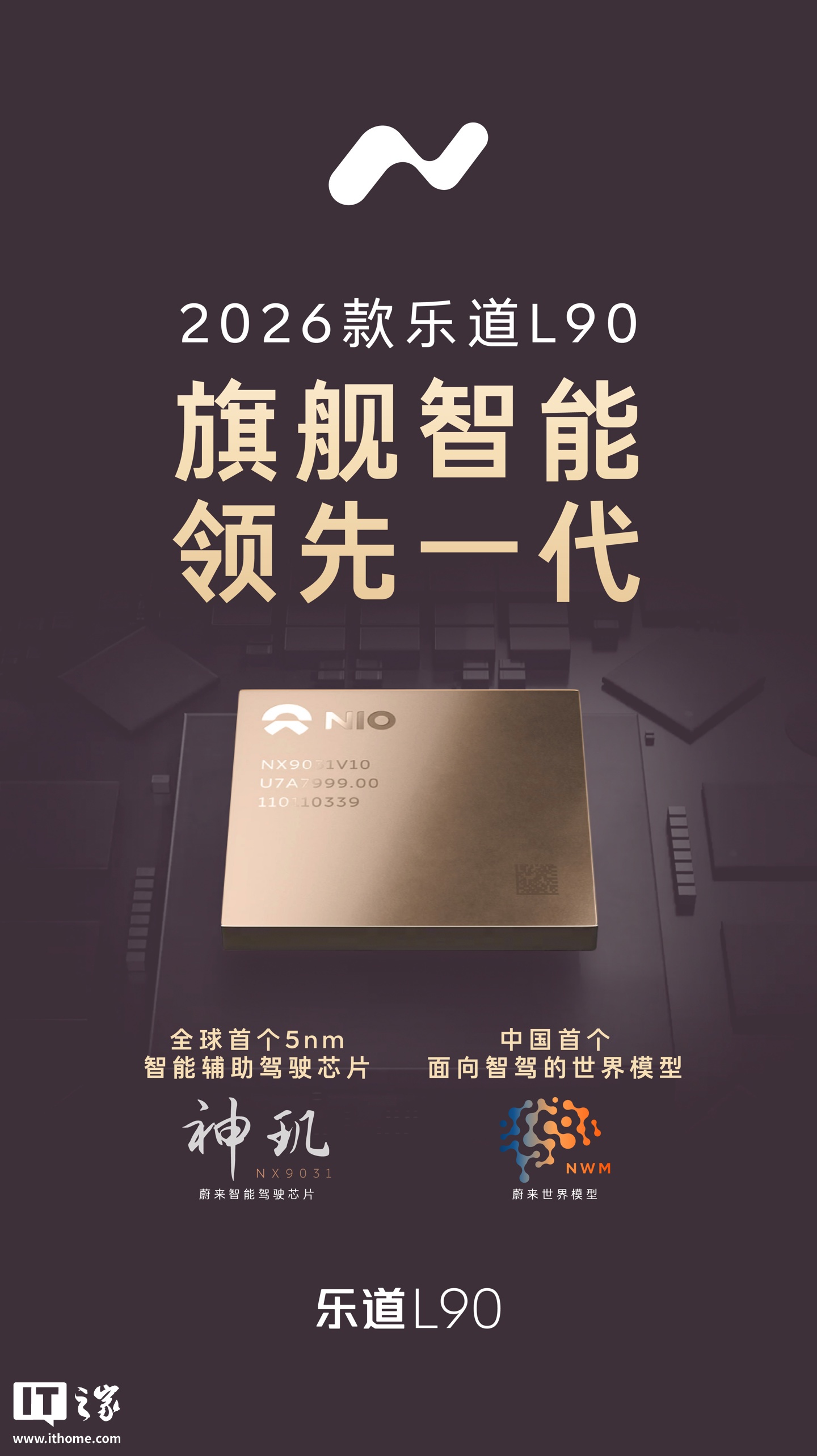 IT之家 4 月 12 日消息,蔚来乐道昨日宣布,2026 款乐道 L90 将搭载高阶智能辅助驾驶芯片「神玑 NX9031」与最新版「蔚来世界模型 NWM」,并在 4 月 21 日的乐道智能科技暨 2026 款 L90 发布会正式上市。IT之家注意到,蔚来汽车科技(安徽)有限公司副总裁白剑昨日发文谈及了此事。他表示,2026 款乐道 L90 将搭载满血版神玑芯片 NX9031,这是业界首款采用 5