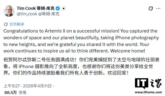 IT之家 4 月 12 日消息,上周在阿耳忒弥斯 2 号任务绕月球背面飞行期间,美国国家航空航天局(NASA)“猎户座”飞船上的宇航员使用 iPhone 17 Pro Max,以地球为背景拍摄了自拍。如今机组人员已平安返回地球,苹果公司首席执行官蒂姆 · 库克与营销主管格雷格 · 乔斯维亚克均通过社交媒体向他们的任务圆满成功表示祝贺,并着重提及了 iPhone 的参与。库克写道:“你们精彩捕捉了太