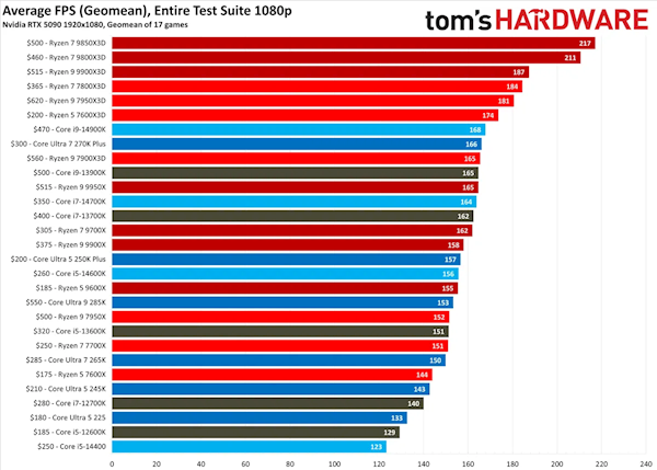 快科技4月12日消息,Tom's Hardware刚刚更新了桌面CPU天梯榜。作为有30年CPU测试积淀的老牌科技媒体,这次他们给每款参测CPU跑了超200项专项测试,最终从游戏、单线程、多线程三大核心维度,敲定了AMD和Intel桌面处理器的最新座次。这次更新重点覆盖DDR5平台,把两家最新的桌面产品线全测了个遍,也是目前消费级桌面CPU最权威的性能排名。Average FPS (Geomean