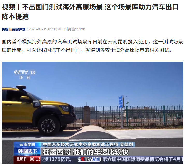 IT之家 4 月 12 日消息,据央视新闻今日报道,国内首个模拟海外高原的汽车测试场景库日前在云南昆明投入使用,这一测试场景库的建成,可以让我国汽车不出国门,就得到等效于海外高原场景的相关测试。在云南昆明这个海拔近 2000 米的汽车测试场内,这里的高原动态广场、直线性能道、墨西哥路、加速噪声路、坡道等都是模拟一些高海拔海外国家的道路建设的。以“墨西哥路”为例。在这段路面上,这里有 4 厘米高强度