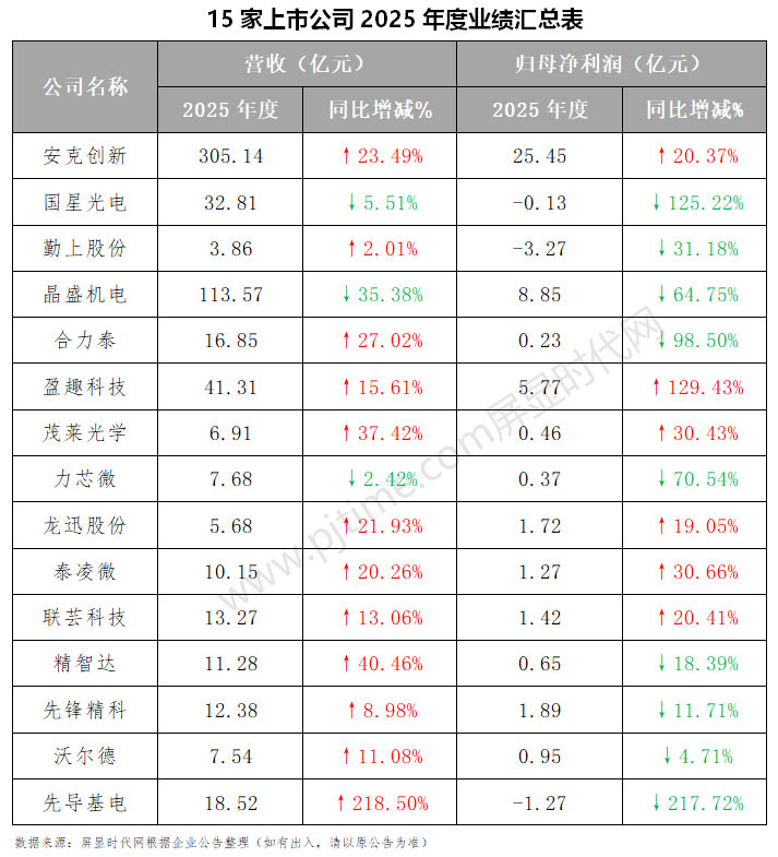 近日,安克创新、国星光电、勤上股份、晶盛机电、合力泰、盈趣科技、茂莱光学、力芯微、龙迅股份、精智达、先锋精科等15家覆盖投影、LED、电子纸、车载、光学、AI、显示驱动、装备与材料等多个显示与半导体相关细分领域的代表性企业,陆续披露2025年度业绩财报,集中展现了行业在技术迭代与市场变革中的发展态势。 汇总15家企业财报数据可见,行业整体呈现“营收增长面广、盈利分化加剧”的鲜明格局。营收端表现亮眼