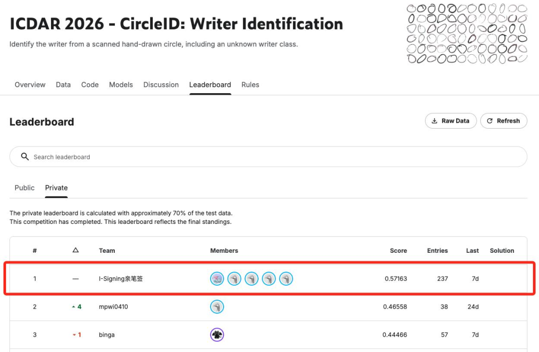 ◎ 科技日报记者 雍黎 通讯员 张廉日前,在ICDAR 2026-CircleID:Writer Identification(圆圈书写者身份识别)全球挑战赛中,来自重庆两江新区的企业重庆亲笔签数字科技有限公司(以下简称“亲笔签”)的算法专家覃勋辉率领团队,力压全球113支参赛队伍,以超第二名10.6个百分点的绝对优势斩获世界第一。ICDAR是全球文档分析与识别领域最具权威性的国际学术组织,其主办