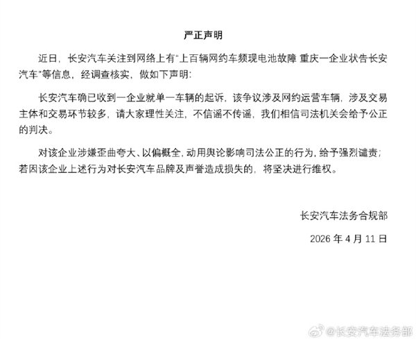 快科技4月11日消息,长安汽车今日发布声明称,近日,公司关注到网络上有“上百辆网约车频现电池故障,重庆一企业状告长安汽车”等信息,经调查核实,做如下声明:长安汽车确已收到一企业就单一车辆的起诉,该争议涉及网约运营车辆,涉及交易主体和交易环节较多,请大家理性关注,不信谣不传谣,我们相信司法机关会给予公正的判决。对该企业涉嫌歪曲夸大、以偏概全,动用舆论影响司法公正的行为,给予强烈谴责;若因该企业上述行