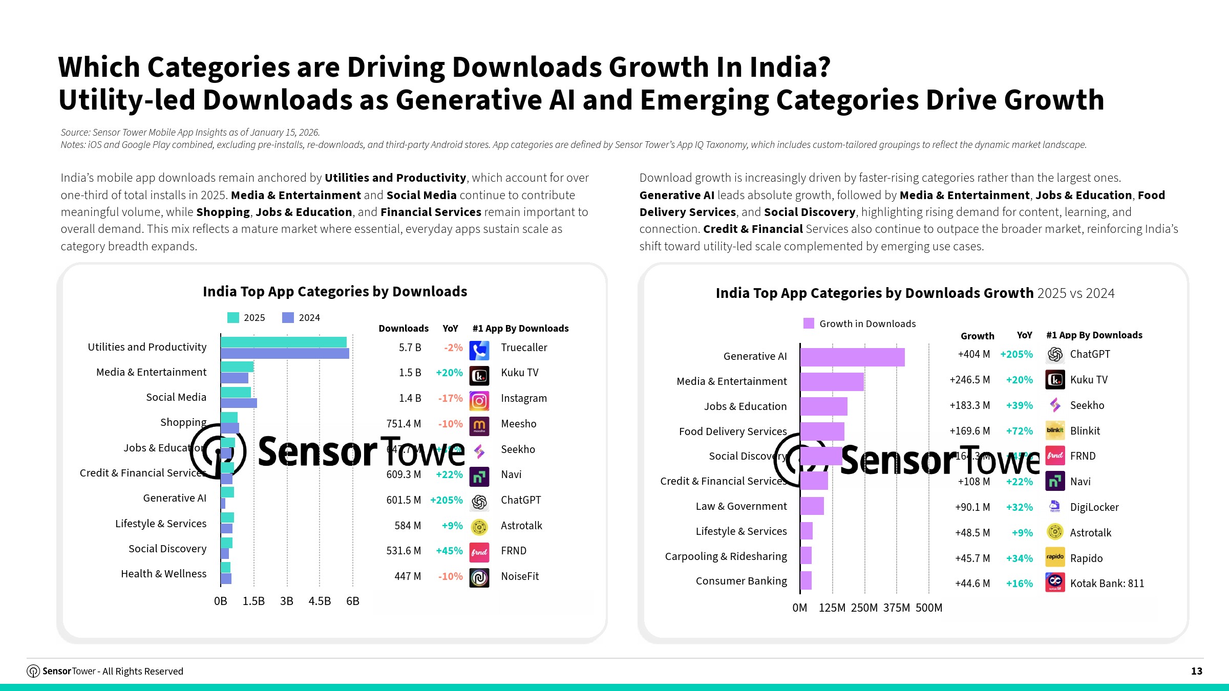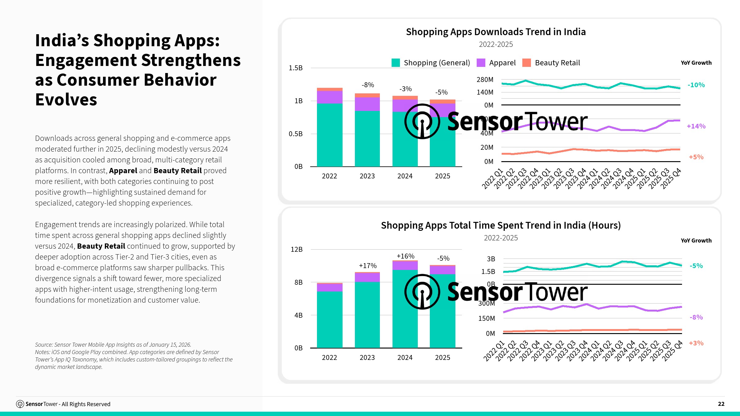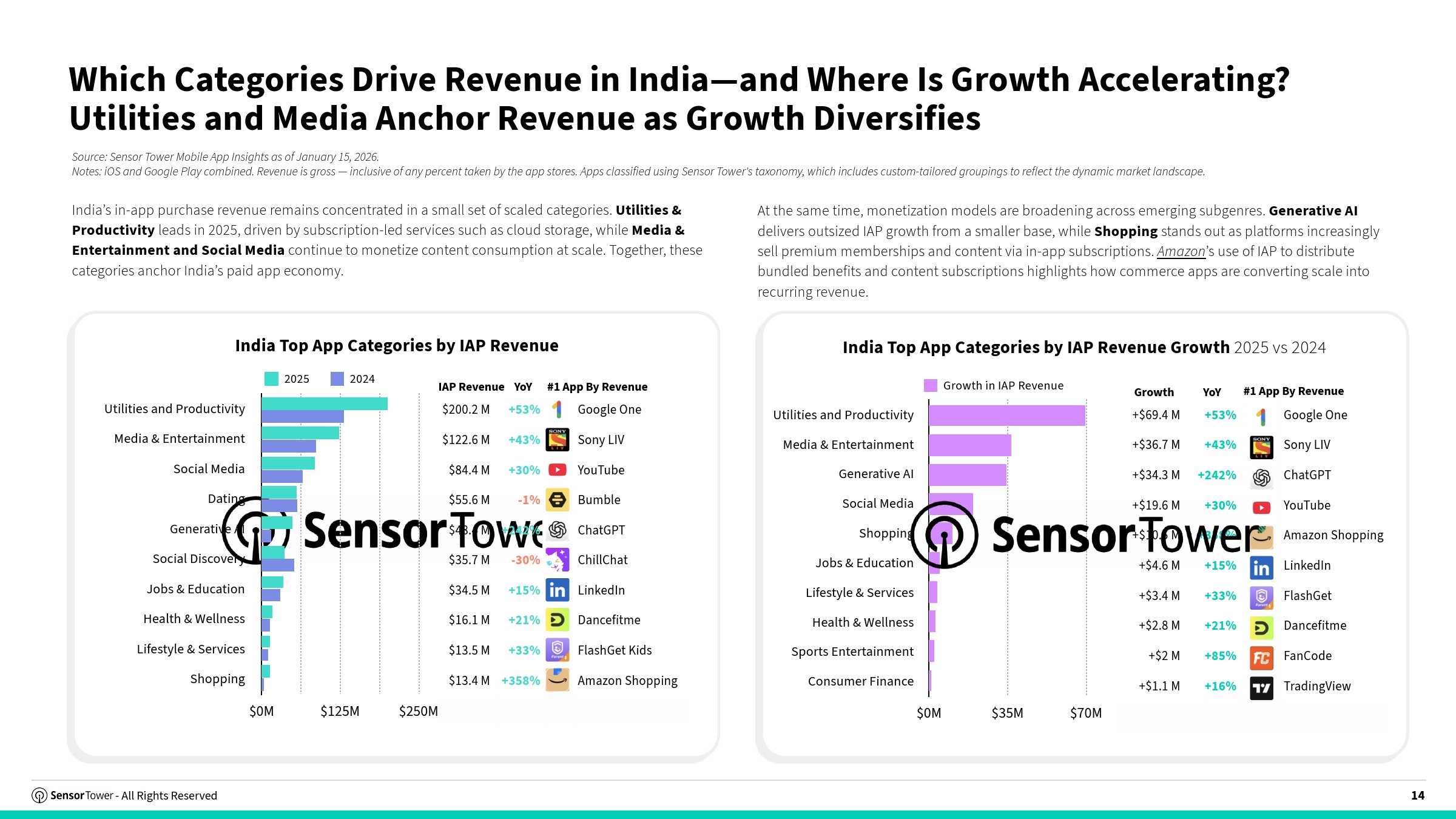 印度移动应用市场正从“规模驱动”迈入“价值驱动”阶段,呈现出成熟市场特征。2025年全年下载量达255亿次,同比增长4%,但较此前高速扩张明显趋稳;与此同时,总使用时长达到1.23万亿小时,同比增长9%,人均年使用时长超过840小时,表明用户粘性持续增强。更关键的是,应用内购收入突破10亿美元,同比增长27%,预计2026年将升至12.5亿美元,显示变现能力进入加速释放阶段 。