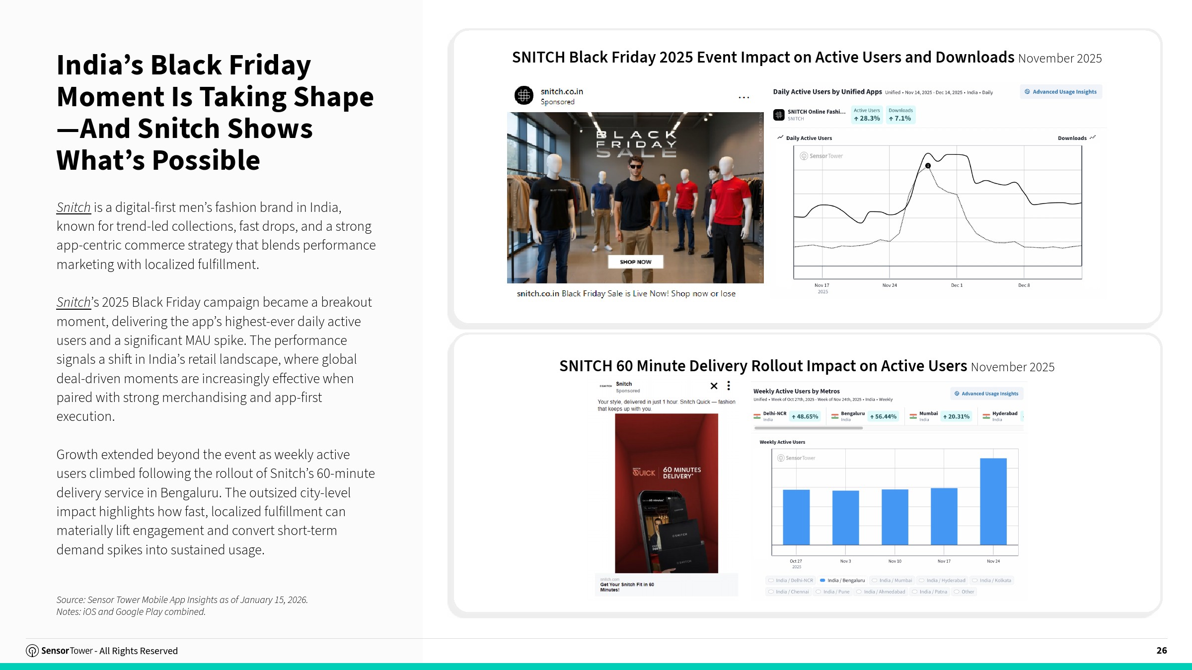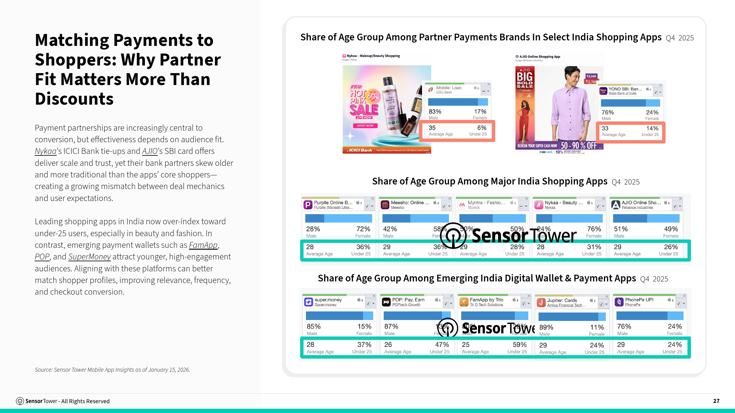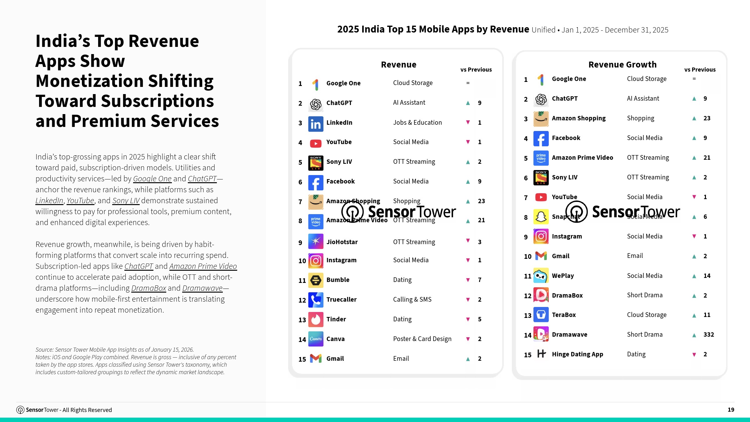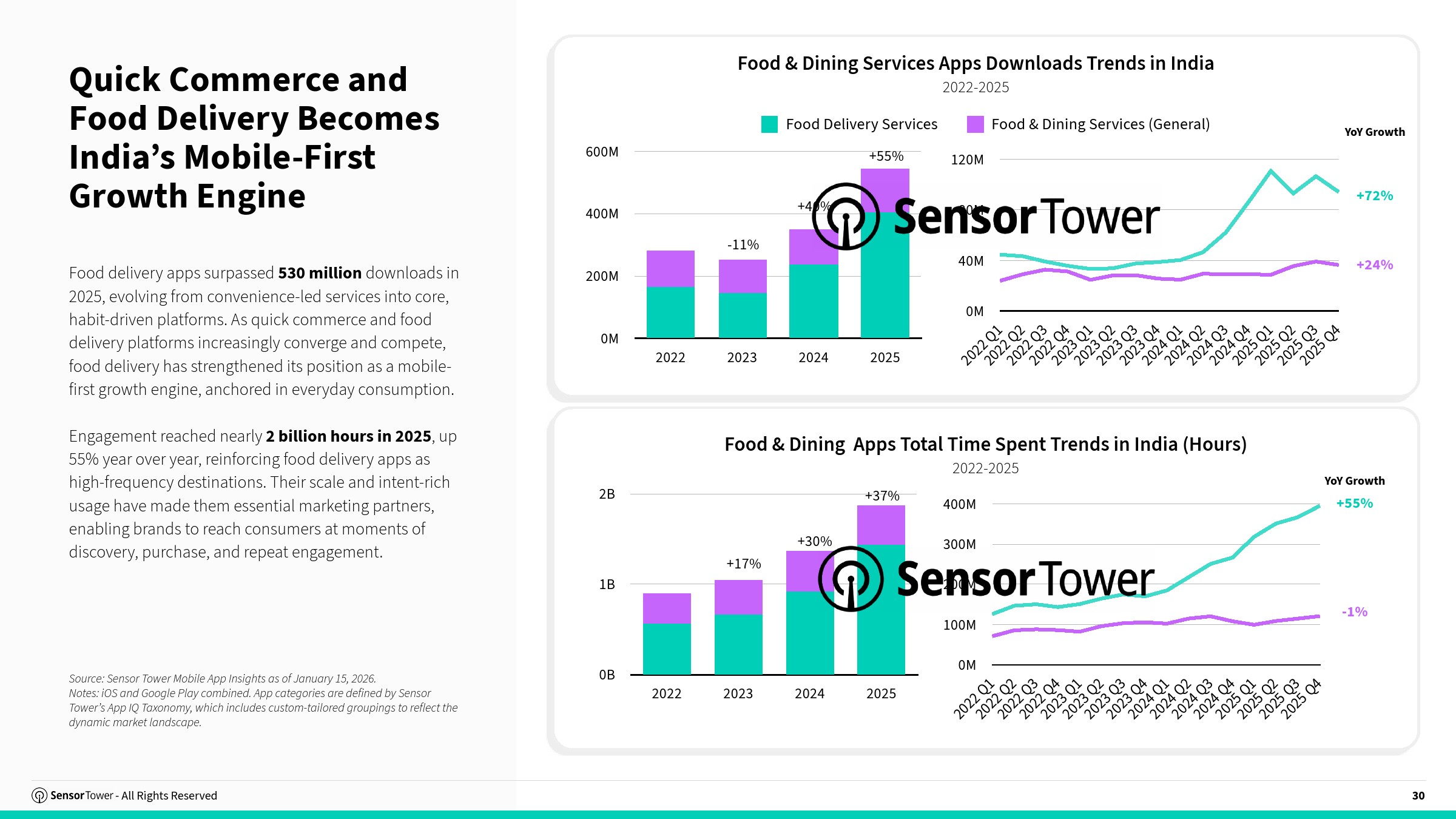 印度移动应用市场正从“规模驱动”迈入“价值驱动”阶段,呈现出成熟市场特征。2025年全年下载量达255亿次,同比增长4%,但较此前高速扩张明显趋稳;与此同时,总使用时长达到1.23万亿小时,同比增长9%,人均年使用时长超过840小时,表明用户粘性持续增强。更关键的是,应用内购收入突破10亿美元,同比增长27%,预计2026年将升至12.5亿美元,显示变现能力进入加速释放阶段 。