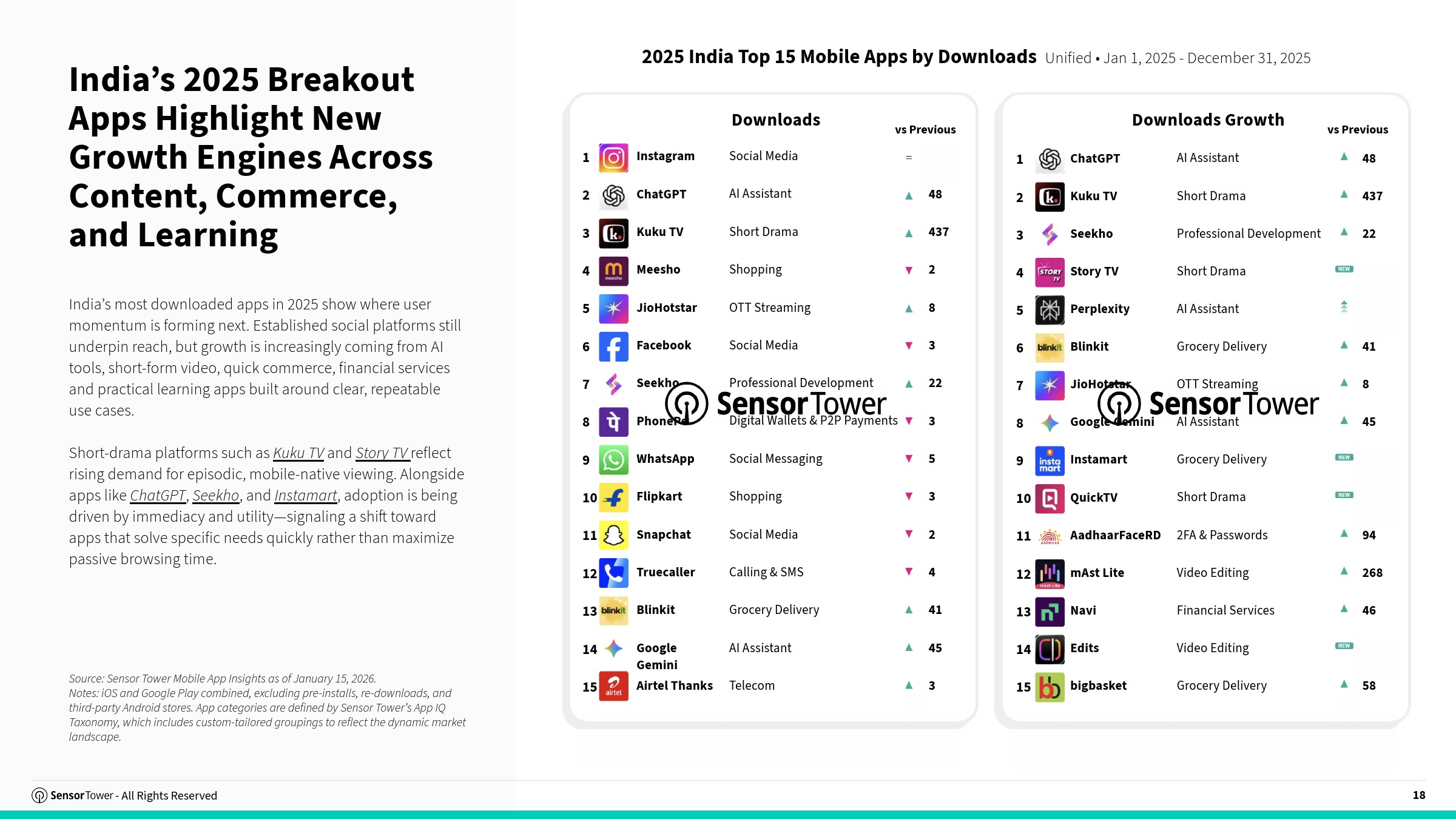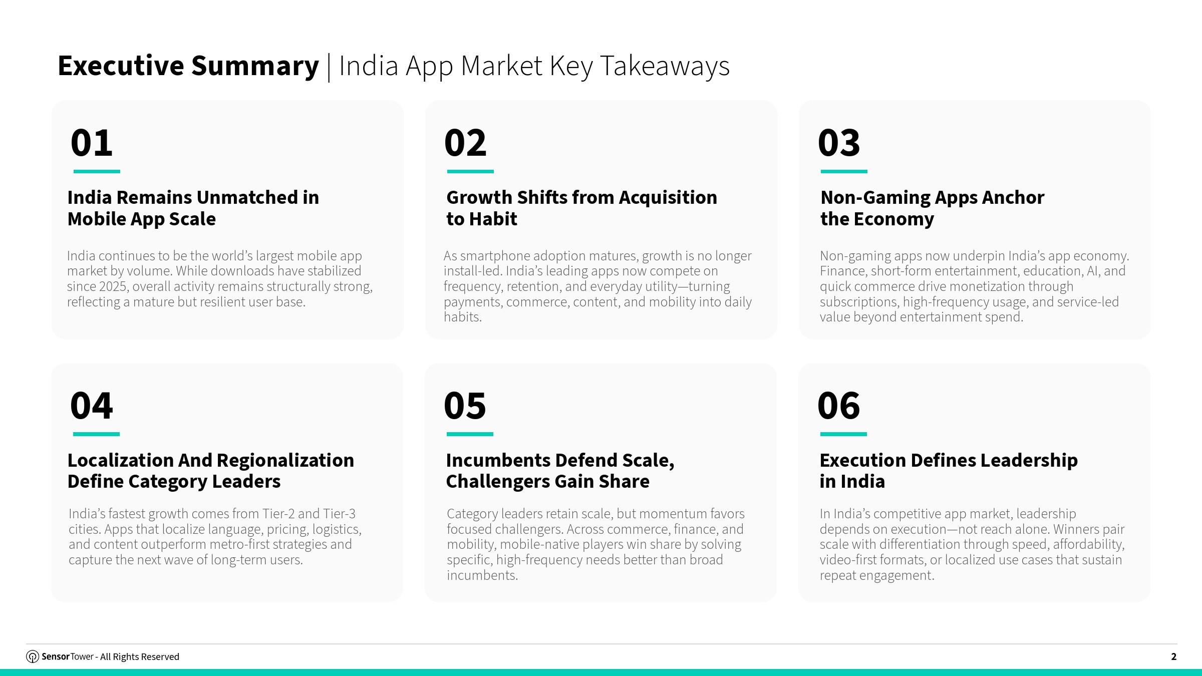 总体来看,印度移动应用市场已完成从用户扩张到价值深化的关键转折。未来增长将更多依赖高频使用场景、订阅与服务收入以及区域下沉能力。随着AI、即时服务与本地化内容持续渗透,印度有望从“全球最大流量市场”进一步演进为“高频消费与多元变现并存的数字经济核心市场”。
