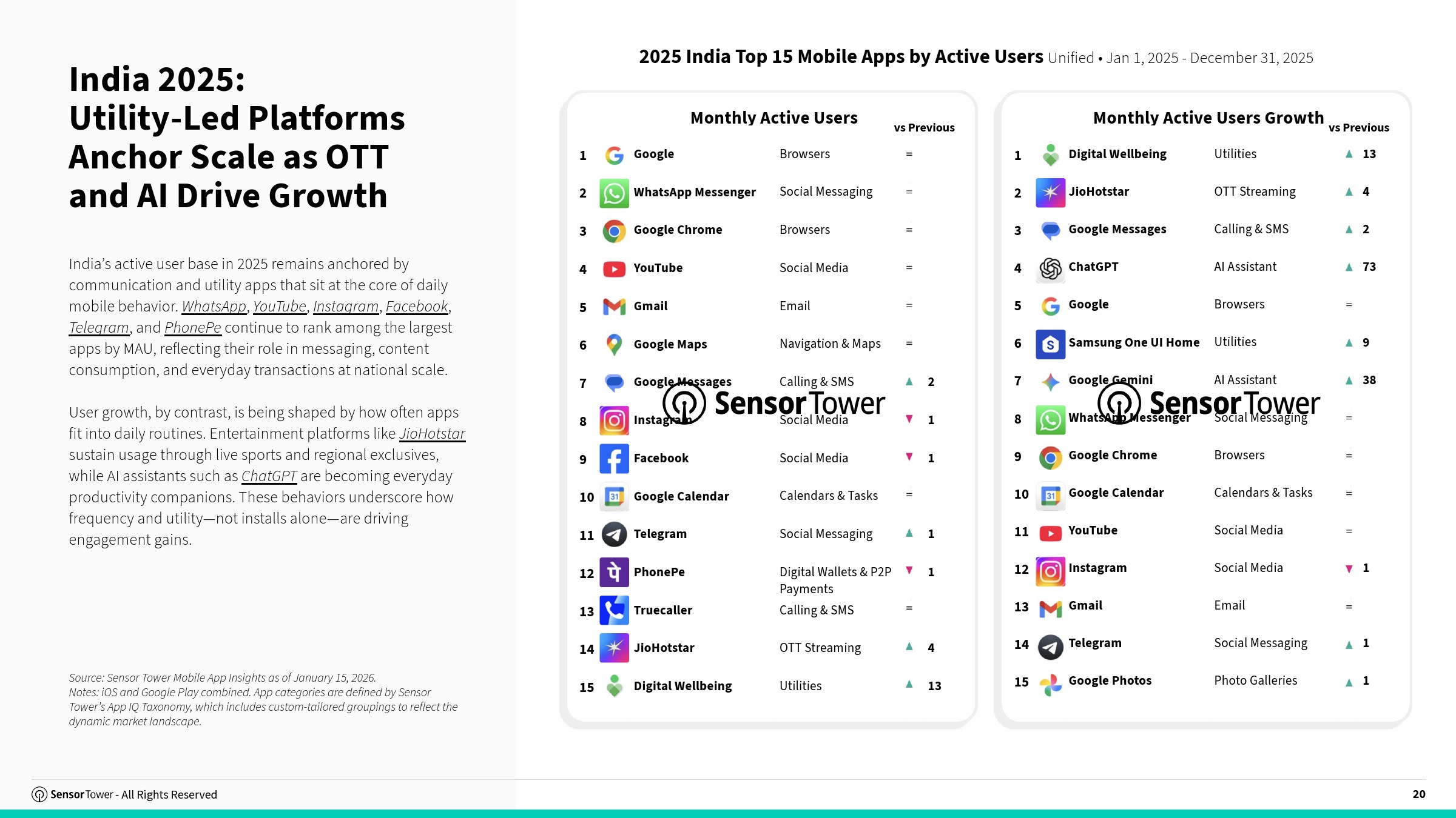 用户行为层面,增长逻辑已从“安装驱动”转向“习惯驱动”。当前印度用户平均每月使用23个应用、每日活跃8个应用,日均使用时长达3.4小时。高频场景集中在支付、电商、内容与出行等刚需服务,这些应用逐步嵌入日常生活,形成稳定使用闭环。社交与工具类仍占据近千亿小时级别使用时长,但增长动能明显向AI、短视频、外卖及出行等新场景迁移 。
