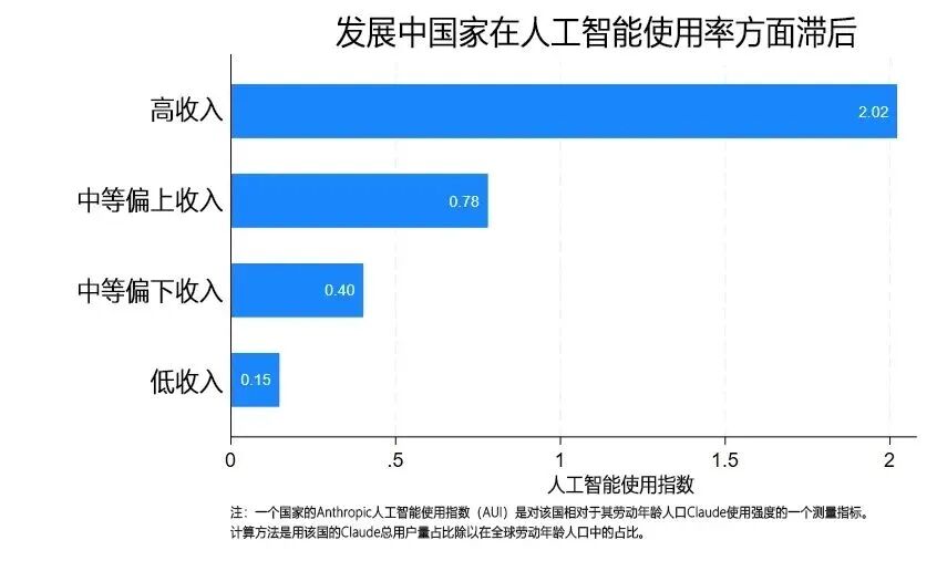 Anthropic机构发布的AI应用指数通过对比各国劳动适龄群体与Claude用户规模的比例关系来评估使用密度。当该指标大于1时,表明该地区AI用户数量超出基于人口结构的预估水平;若小于1,则反映人工智能应用普及度未达人口基数应有的标准。在各国分组中,仅高收入经济体(HIC)的指标数值突破1,均值达到2.02,其余国家群体均未达此标准。统计数据显示,高收入地区AI应用普及度约为中等收入经济体(MIC)的3.8倍,且唯有该组别超越了世界人均水平线。