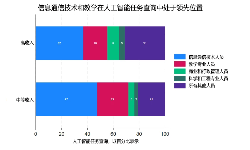 不同国家用户群体呈现显著区别。Anthropic的研究依据职业属性对Claude使用者进行划分。发达经济体中,用户职业分布较为均衡;而在发展中国家,使用人群呈现高度聚集特征:ICT从业者占比高达48%,教育工作者占24%。仅这两类人群在发展中国家人工智能使用者中就占据近75%,该比例在发达国家则略超50%。该集中趋势可能源于这些从业者相比其他中等收入国家同行具备更强的需求水平和更优的获取条件。此结论与多项研究结果一致,数据显示多数中等收入国家逾50%的教师群体已实际应用人工智能技术。鉴于数据采集有限,本研究未将低收入国家纳入分析范围。