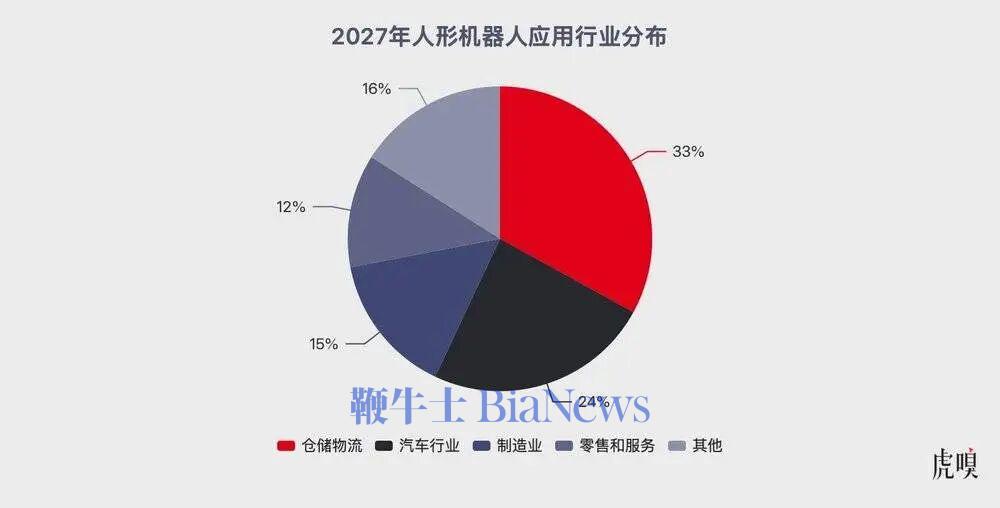 据Counterpoint Research报告,到2027年,约72%的人形机器人将用于仓储物流、汽车行业和制造业,其中仓储物流占33%,汽车行业占24%,制造业占15%。零售和服务领域占比仅12%。家庭机器人更可能在2040年代才出现。